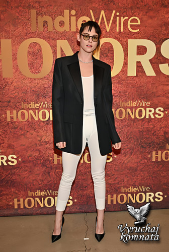 Кристен Стюарт, по всей видимости, идеально подходит для этой роли. Вчера вечером на церемонии вручения наград IndieWire Honors режиссёр фильма «Хронология воды» появилась на дорожке в прозрачных белых леггинсах, надетых поверх белых трусов, создающих двойной пояс с надписью «CK». Стилистом выступила Тара Свеннен. Она решила не надевать их с драпированным белым топом, а вместо этого выбрала такую же прозрачную белую майку, которую надела под свободный чёрный блейзер. Свой образ она завершила чёрными туфлями-лодочками с острым носком, круглыми очками с сепией и двумя бриллиантовыми теннисными ожерельями на ключицах.