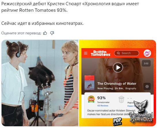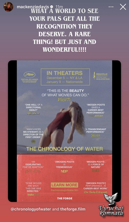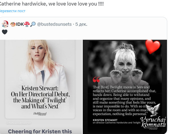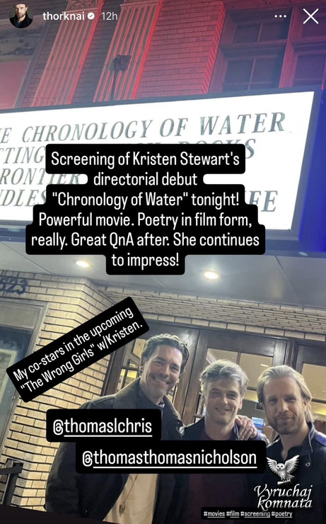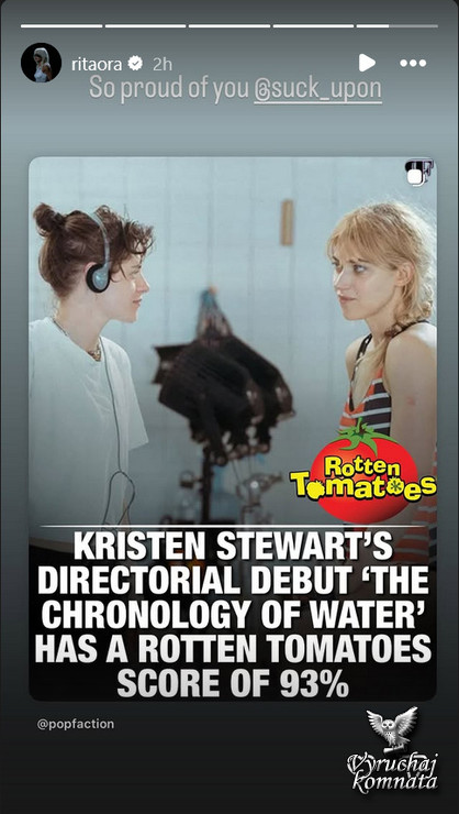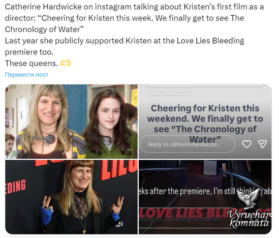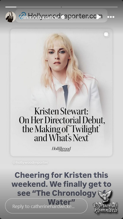 Кэтрин Хардвик в Instagram рассказывает о первом фильме Кристен в качестве режиссёра: «Болеем за Кристен на этой неделе. Наконец-то увидим «Хронологию воды». В прошлом году она также публично поддержала Кристен на премьере фильма «Любовь, ложь, кровотечение».