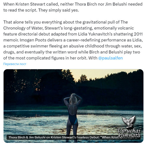 Когда Кристен Стюарт позвонила, ни Торе Бёрч, ни Джиму Белуши не пришлось читать сценарий. Они просто сказали «да». Одно это уже говорит о притяжении «Хронологии воды» – долго вынашиваемого, эмоционально бурного дебюта Стюарт в полнометражном режиссёрском фильме, экранизации потрясающих мемуаров Лидии Юкнавич 2011 года. Имоджен Путс играет Лидию, пловчиху, которая спасается от жестокого детства через воду, секс, наркотики и, в конечном итоге, через письменное слово, в то время как Бёрч и Белуши играют двух самых сложных персонажей в её жизни. С @paulsalfen