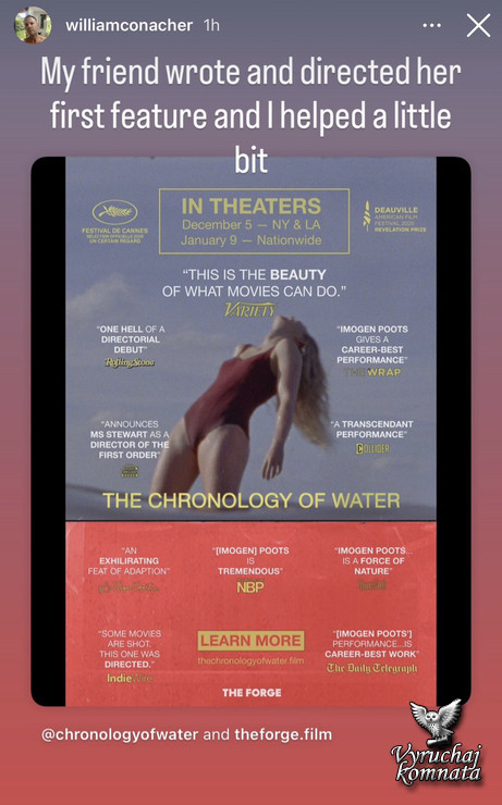 «Которую Кристен Стюарт адаптировала и срежиссировала. Она потрясающая! Боже мой, каким же великолепным режиссёром она оказалась, Боже мой! Она просто попала в точку». — Джим Белуши Бобби Ли о «Хронологии воды»