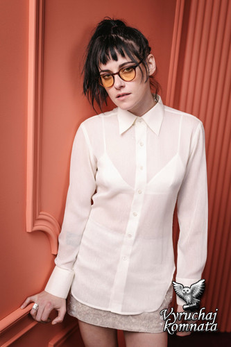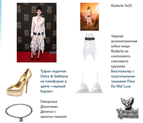 Звезда «Сумерек» надела комплект из прозрачного кружева, полностью демонстрируя белый треугольный бюстгальтер Fleur du Mal и чёрное кружевное нижнее бельё. Её блузка выделялась оборкой на горловине, манжетами с рюшами и завязкой на груди. Юбка миди с асимметричным подолом доходила до пупка Стюарт.