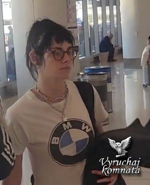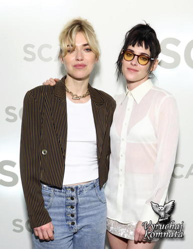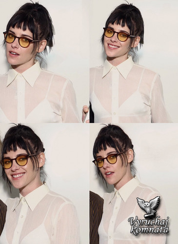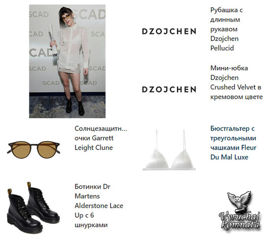 Для этого памятного момента Стюарт выбрала ещё один прозрачный образ, на этот раз рубашку на пуговицах Dzojchen, которую она надела поверх того же белого треугольного бюстгальтера Fleur du Mal. Блузку она дополнила блестящей мини-юбкой, также от этого люксового бренда. Стюарт добавила изюминку образу, дополнив его чёрными ботинками Dr. Martens на шнуровке и солнцезащитными очками Clune от Garrett Leight.