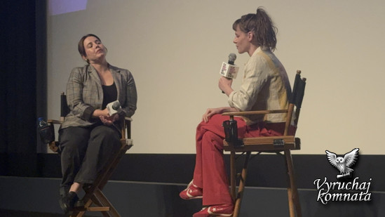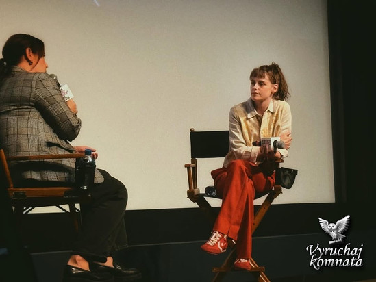 Такой другой тип эм...инерции. Как я думаю, я чувствовала технические ограничения структуры, эм... процесса, времени, и того, кто должен контролировать это разграничение ответственности, и как защитить хаос, но при этом позволить всем чувствовать себя свободно, легко и безопасно, и как бы погрузиться в эм... процесс, не пытаясь слишком сильно всё контролировать. В общем, как я и говорю, я думаю, что для меня есть создание образа, а затем есть позволение жизни существовать внутри этих образов. И вот тут-то я и вступаю в игру как актриса. Мне нравится наполнять предвзятые представления новым огнём, новыми вопросами, новыми желаниями. И, эм, было приятно иметь возможность сделать кучу домашней работы и создать своего рода сцену, на которой другие люди могли бы исследовать мои идеи, свои идеи. Эм, и я действительно думаю, что это как мои любимые режиссёры в своих фильмах. Я всякий раз, когда я вижу сцену, частью которой я была, я могу, если это кажется связанным и созданным, вы знаете, действительно великим режиссером, я всегда точно знаю, где они находятся в комнате. Понимаете, о чем я? Я помню их по отношению к тому, где находится мое тело в этой сцене. И, э-э, так что, я думаю, вопрос был в том, каково это быть режиссером, а не актрсой? Они действительно, действительно, они, они действительно партнеры для меня в этих двух работах. Я имею в виду, как она помогла мне снять этот фильм. Она помогла мне написать этот фильм. Хм, я думаю, я помогла ей сыграть в этом фильме. И когда я говорю играть, я имею в виду жить. Мы оба проживали этот фильм каждый день. Это было ее тело, но наши ... души были полностью объединены. И, э-э, я имею в виду, причина, по которой я хочу продолжать снимать фильмы как перед камерой, так и за ней, заключается в том, что они во многом движимы одними и теми же импульсами.