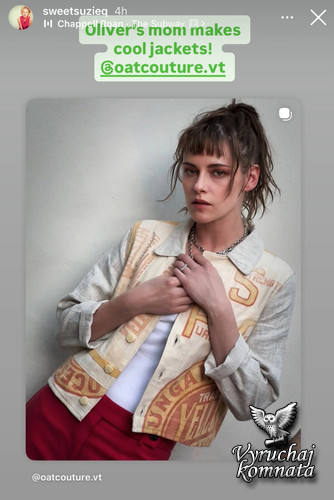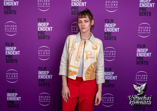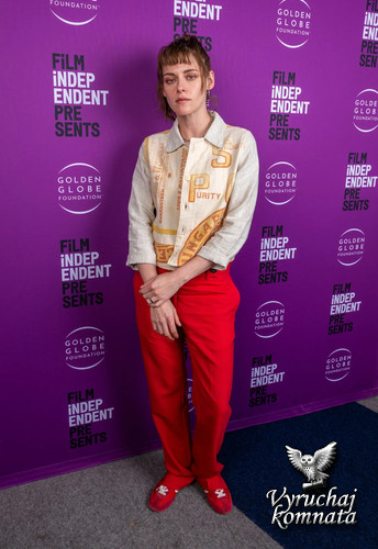 Стюарт дополнила кроссовки ярко-красными прямыми брюками и кремовой курткой с жёлтым графическим принтом. Это те же кроссовки, в которых актриса, сценарист и режиссёр была в прошлом году на премьере фильма «Люби меня» на кинофестивале «Сандэнс». Тогда кроссовки дополняли подвёрнутые синие джинсы, футболка с графическим принтом и бирюзовая куртка.