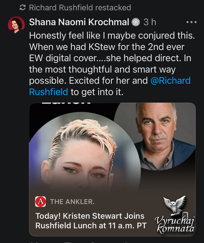 СЕГОДНЯ В 11:00 по тихоокеанскому времени: Кристен Стюарт присоединилась к @richardrushfield на обеде The Rushfield, чтобы поговорить о своем ярком режиссерском дебюте «Хронология воды» и своих взглядах на состояние индустрии развлечений.