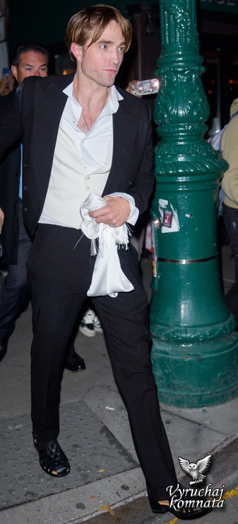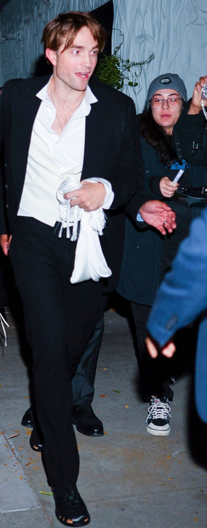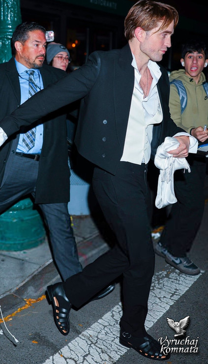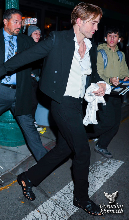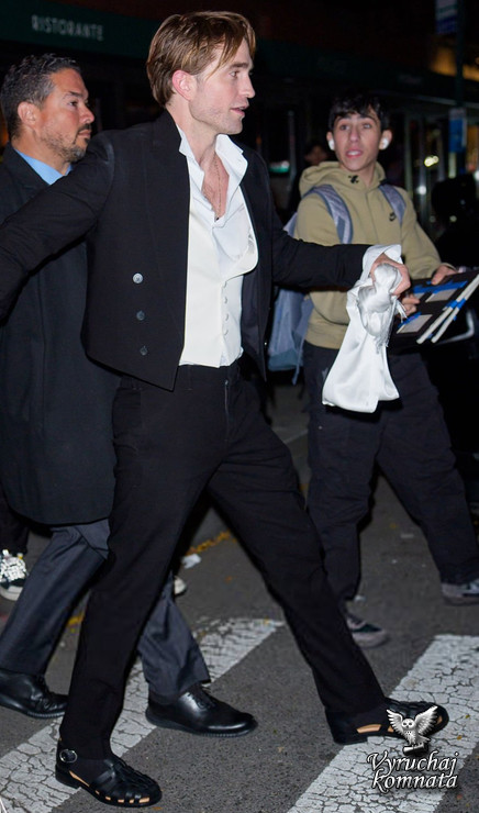 Внизу, великолепно сшитые брюки Паттинсона аккуратно лежали поверх неожиданной пары кожаных сандалий в стиле «рыбак» — особенно смелый ход в Нью-Йорке в ноябре. Этот выбор тоже был чем-то вроде компромисса между родителем и ребёнком (или стилистом и знаменитостью): « Ты можешь надеть свои светящиеся кроссовки, если позволишь мне закончить расчёсывать твои волосы». (Как обычно, причёска Паттинсона была идеально растрёпанной и развеваемой на ветру.)