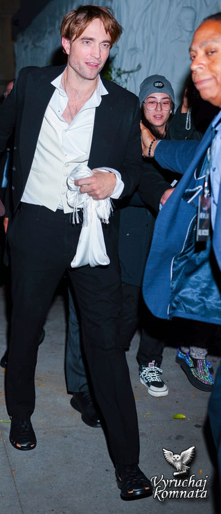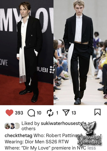 Вечерний образ Паттинсона, вдохновлённый мужской коллекцией Dior весна-лето 2026, перекликался с элегантным внешним видом обуви. Он был одет в строгий чёрный костюм и белую рубашку на пуговицах, которая, судя по всему, была накинута поверх длинного белого шарфа с бахромой, закрывающего большую часть его правой ноги.