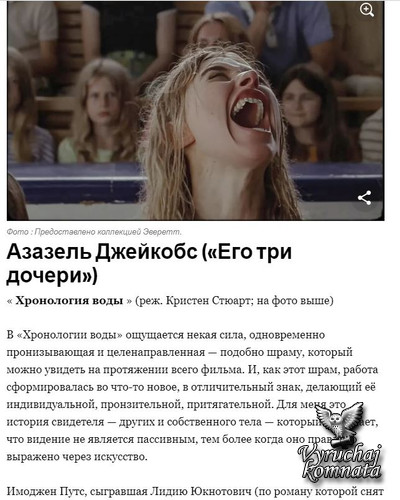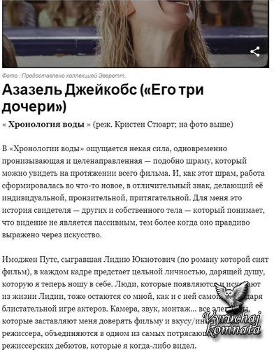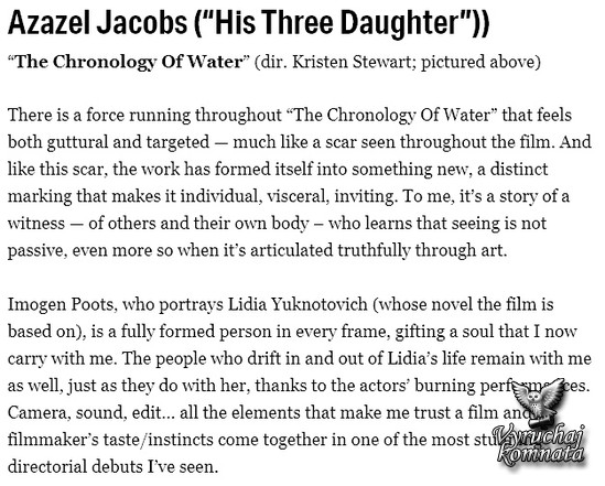 Ещё один потрясающе удачный дебют, который вряд ли получит заслуженное признание на конкурсах, — это «Хронология воды» Кристен Стюарт. Она — захватывающий, уникальный новый голос, появившийся в этом году.