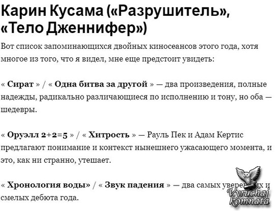 Я заметила, например, что меня тянет к фильмам, которые являются экранизациями произведений писателей или рассказывают о писателях; в которых фигурируют женщины на грани нервного срыва или молодые женщины, переживающие период взросления; и которые достаточно смелы в формальном плане, чтобы продвинуть кинематограф в будущее. В следующем году я надеюсь уделить больше внимания фильмам из других регионов мира, более экспериментальным работам, которые меня сбивают с толку, но делают это продуктивно, вдохновляюще и бросают вызов. Я хочу быть удивлена.