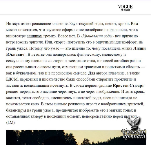 Экранизации книг порождают два типа фильмов: те, которые транслитерируют, и те, которые переводят. В то время как первые настаивают на сохранении духа исходного материала ценой настолько точного воспроизведения, что дело доходит до жесткой постановки, подобно прямой пересадке со страницы на экран, вторые настолько доверяют обоим медиумам, допуская некий поэтический разрыв между книгой и фильмом, как если бы переводили идиому с одного языка на другой. Экранизация может быть рискованным предприятием для опытных кинематографистов, не говоря уже о новичках. Тем более, если вы актриса первой величины, чей режиссерский дебют, вероятно, столкнется с большим вниманием. В свете этого решение Кристен Стюарт экранизировать мемуары 2011 года «Хронология воды» американской писательницы Лидии Юкнавич, которая, вероятно, больше известна своей второй книгой (и первой, опубликованной крупным издательством) « Маленькие спинки детей» , говорит о том, что совпадение между художником и материалом было отнюдь не натянутым или случайным. – Савина П. ( полный обзор )