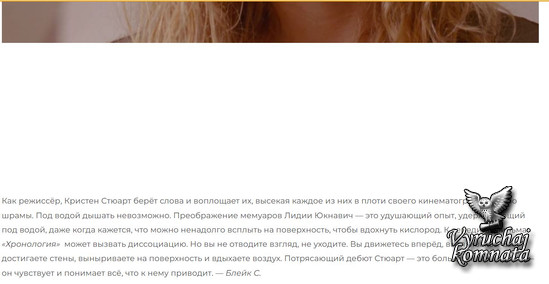 Как режиссёр, Кристен Стюарт берёт слова и воплощает их, высекая каждое из них в плоти своего кинематографа, словно шрамы. Под водой дышать невозможно. Преображение мемуаров Лидии Юкнавич — это удушающий опыт, удерживающий под водой, даже когда кажется, что можно ненадолго всплыть на поверхность, чтобы вдохнуть кислород. К середине фильма «Хронология» может вызвать диссоциацию. Но вы не отводите взгляд, не уходите. Вы движетесь вперёд, вытягиваясь. Вы достигаете стены, выныриваете на поверхность и вдыхаете воздух. Потрясающий дебют Стюарт — это больше, чем катарсис — он чувствует и понимает всё, что к нему приводит. — Блейк С.