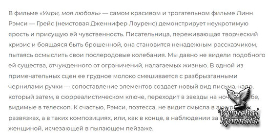 В отличие от любой мифологии, основанной на создании вымышленных миров, возвращение Линн Рэмси демонстрирует хаос, рожденный из хаоса, в центре которого находится страстная жена и новоиспеченная мать Грейс (Дженнифер Лоуренс). Непреклонная и животная в том, как она переживает смену своей многообещающей писательской жизни в Нью-Йорке на жизнь домохозяйки в деревне, она становится проводником всего подавленного во вселенной. Особая мировая скорбь подчеркивает игру Лоуренс, когда она танцует вокруг прихоти своего заботливого, хотя и ничего не понимающего мужа (Роберт Паттинсон), и все, что нам остается, это предвкушать взрыв: чувств, скорби по непрожитой жизни, любви, которая может поглотить только этот новосозданный мир. — Савина П.