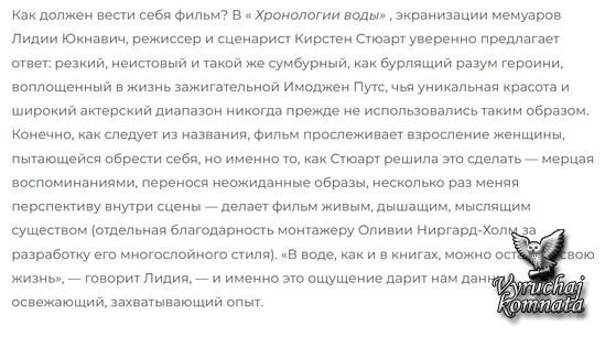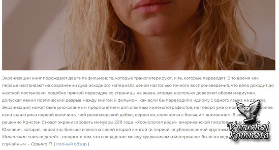 Экранизации книг порождают два типа фильмов: те, которые транслитерируют, и те, которые переводят. В то время как первые настаивают на сохранении духа исходного материала ценой настолько точного воспроизведения, что дело доходит до жесткой постановки, подобно прямой пересадке со страницы на экран, вторые настолько доверяют обоим медиумам, допуская некий поэтический разрыв между книгой и фильмом, как если бы переводили идиому с одного языка на другой. Экранизация может быть рискованным предприятием для опытных кинематографистов, не говоря уже о новичках. Тем более, если вы актриса первой величины, чей режиссерский дебют, вероятно, столкнется с большим вниманием. В свете этого решение Кристен Стюарт экранизировать мемуары 2011 года «Хронология воды» американской писательницы Лидии Юкнавич, которая, вероятно, больше известна своей второй книгой (и первой, опубликованной крупным издательством) «Маленькие спинки детей», говорит о том, что совпадение между артистом и материалом было отнюдь не натянутым или случайным. – Савина П.