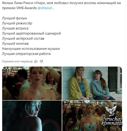 Фильм Линн Рэмси "Умри, моя любовь" (DIE MY LOVE), вышедший на платформе Mubi и с Дженнифер Лоуренс и Робертом Паттинсоном в главных ролях, получил награды за лучшую операторскую работу (Шеймус МакГарви) и за лучшее музыкальное сопровождение (Рейф Берчелл и Иэн Нил).
