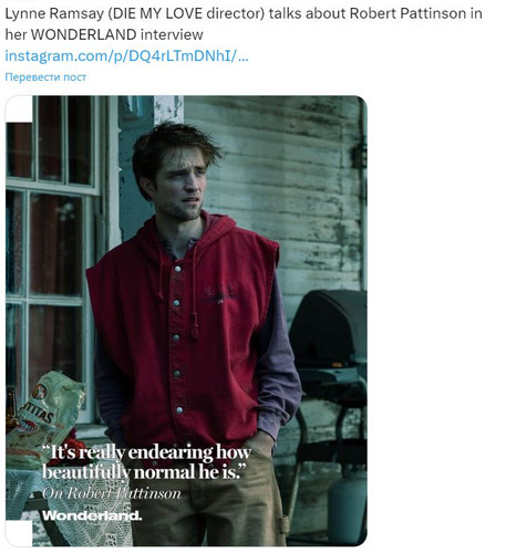 Линн Рэмси (режиссёр фильма «Умри, моя любовь») упоминает Роберта Паттинсона в своём интервью для WONDERLAND: