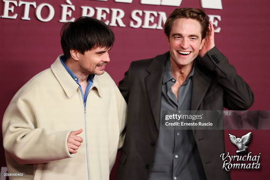 Роберт Паттинсон с режиссером фильма «Драма» Кристоффером Боргли позируют для фотографов на премьере в Риме, Италия.