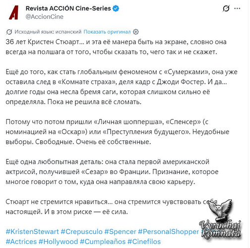 С днем рождения, Кристен Стюарт! (Поздравляем с 36-летием номинантку на премию «Оскар», которая успешно перешла от феномена мировой франшизы к одной из самых смелых и уважаемых актрис независимого кино!)