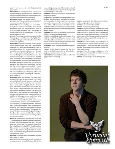 СТЮАРТ: Меня теперь бесит, когда люди останавливаются, потому что я говорю: «Я понимаю, ты сомневался в себе, но этот момент сомнения был просто бесценен». Я хочу стараться этого не делать. (Как актриса) Я не хочу, чтобы меня неправильно поняли. Когда режиссёр говорит: «Кажется, ты прочувствовала это», я всегда отвечаю: «Мне всё равно, что это хорошо выглядит: я хочу сделать это снова». Я эгоистка. Я хочу это попробовать.